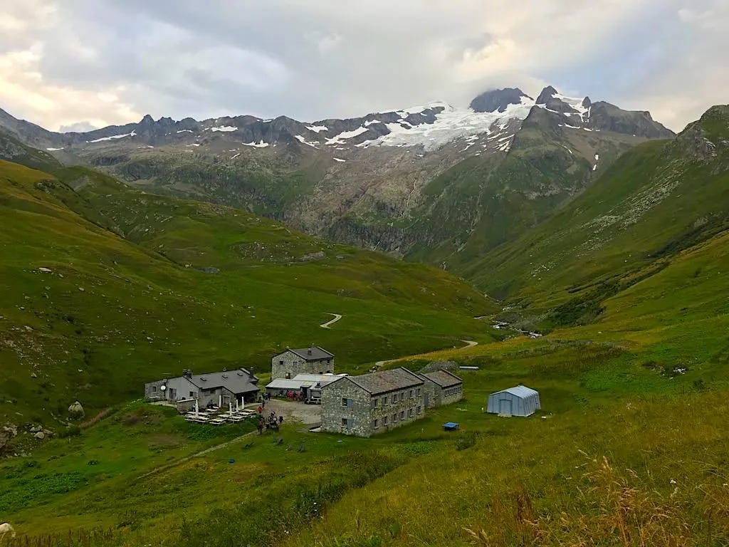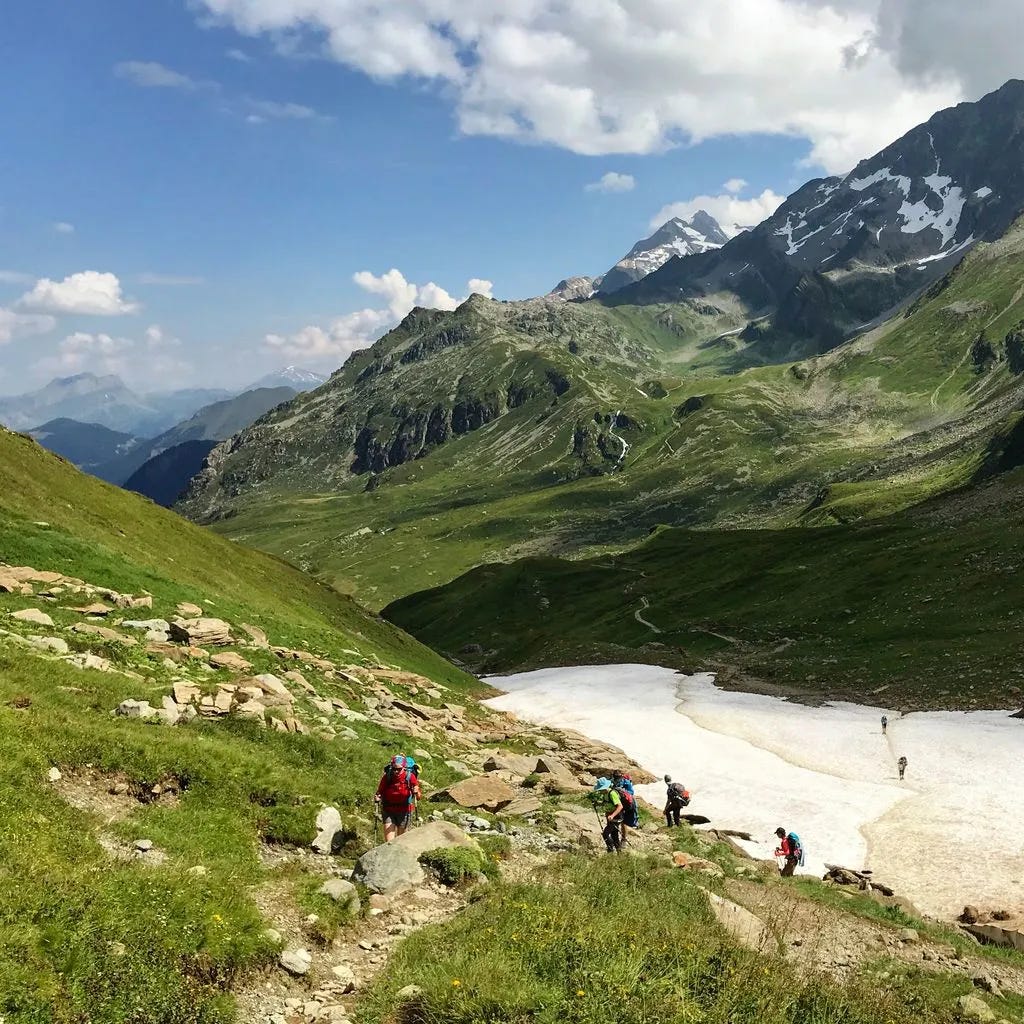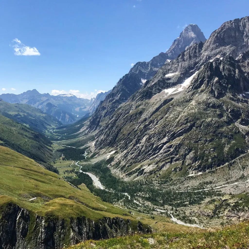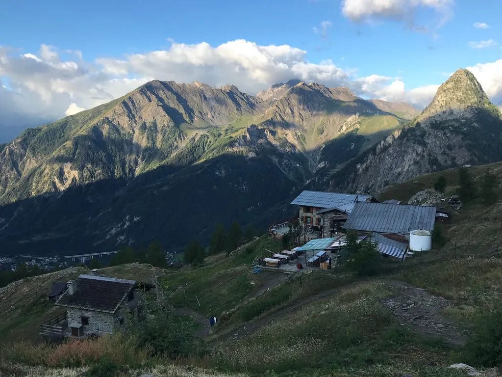 Overnight: Camping des Glaciers La Fouly (17 CHF to camp)A truly epic day: lush green valleys, glaciers for miles, sunshine, and good friends while hiking along Val Ferret. We then climbed over Grand Col Ferret, where we crossed from Italy into Switzerland. Then a long downhill to La Fouly, where we camped for the night under an impressive glacier. Each day I find myself saying that this was my favorite day. The scenery never disappoints. I finally feel like I have my hiking legs back, as I felt strong all day. I even managed to jog some of the flat and downhill sections, while carrying a full pack.