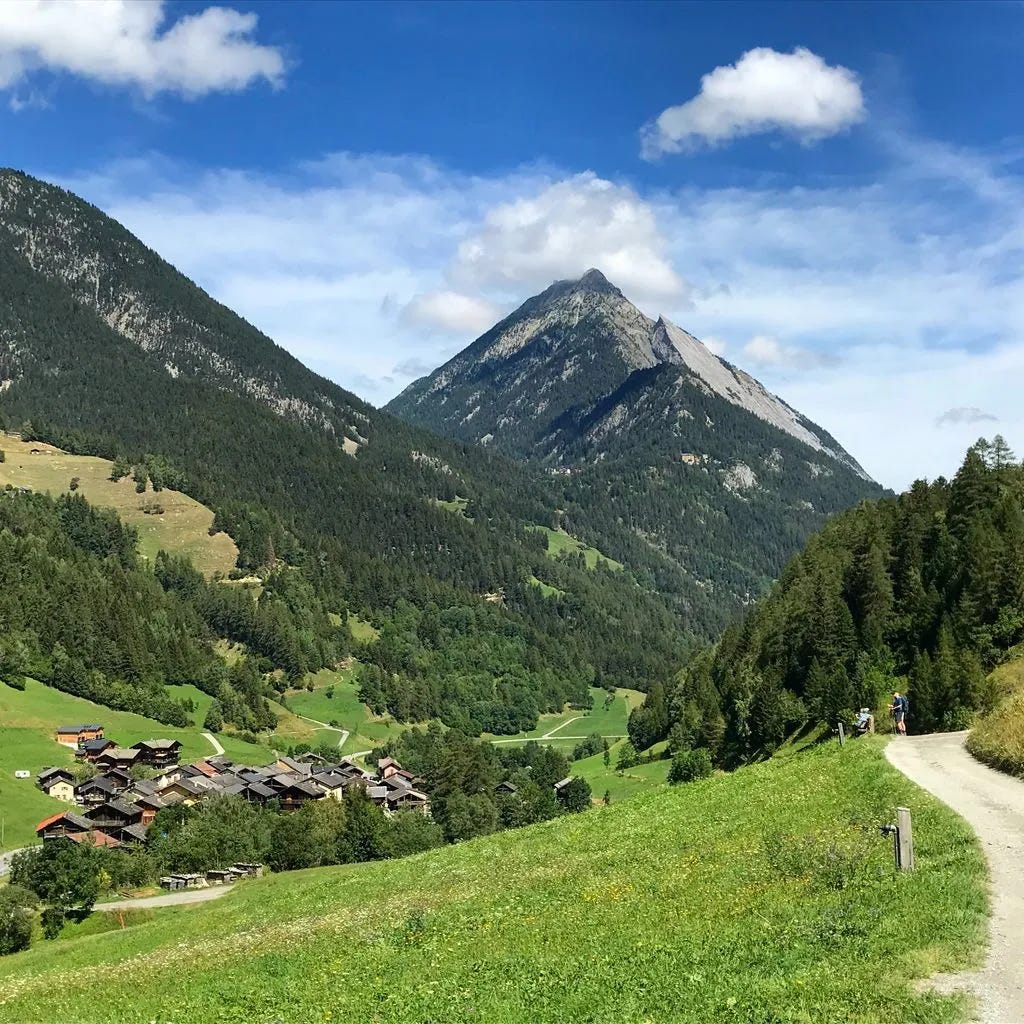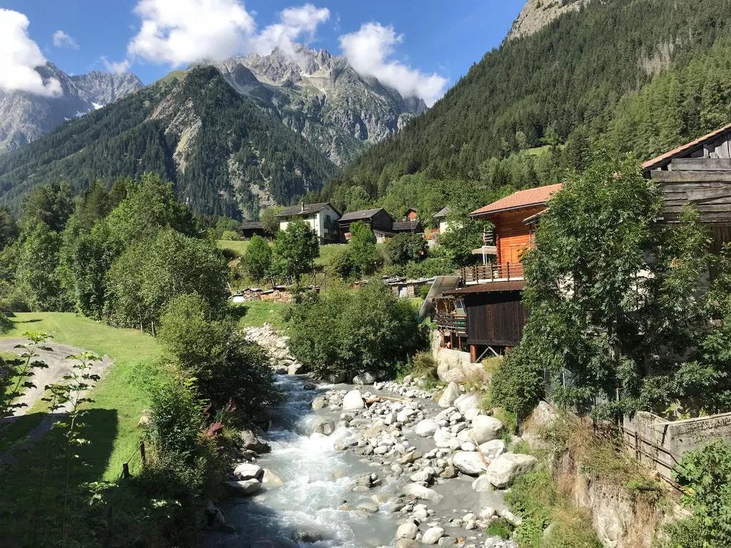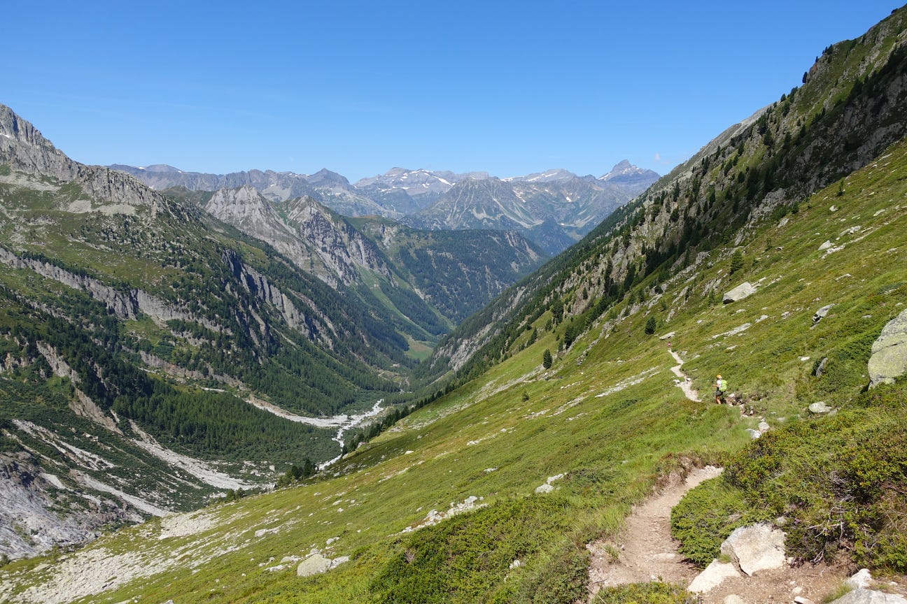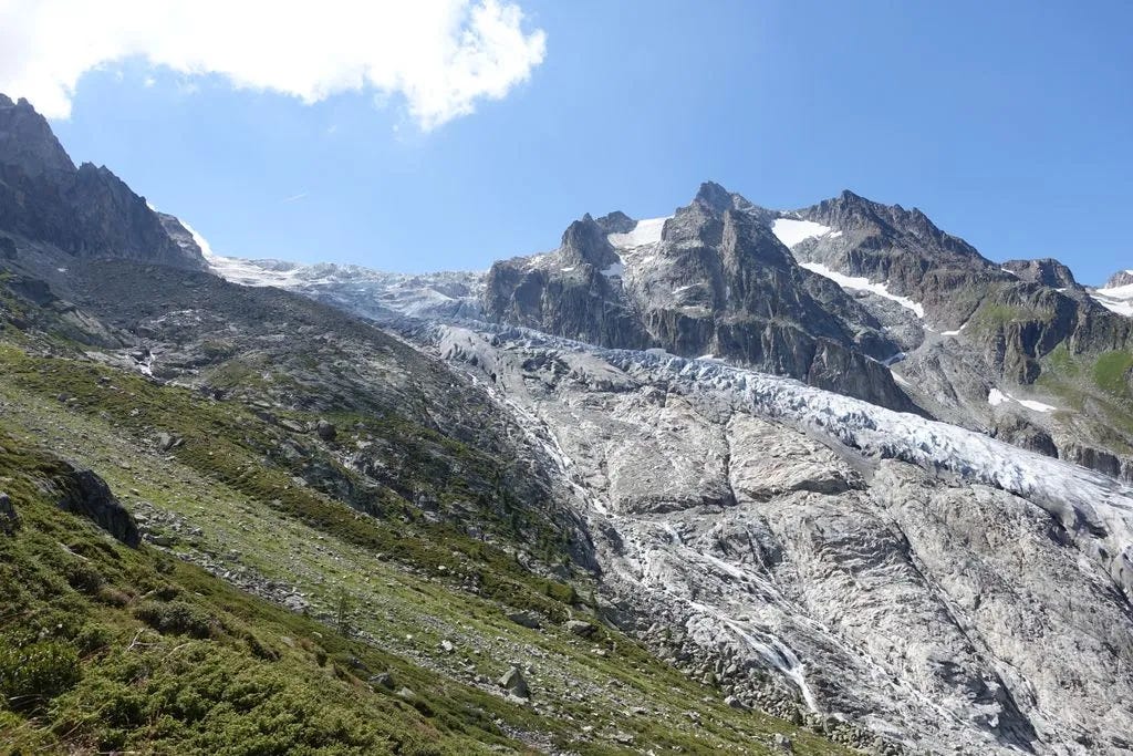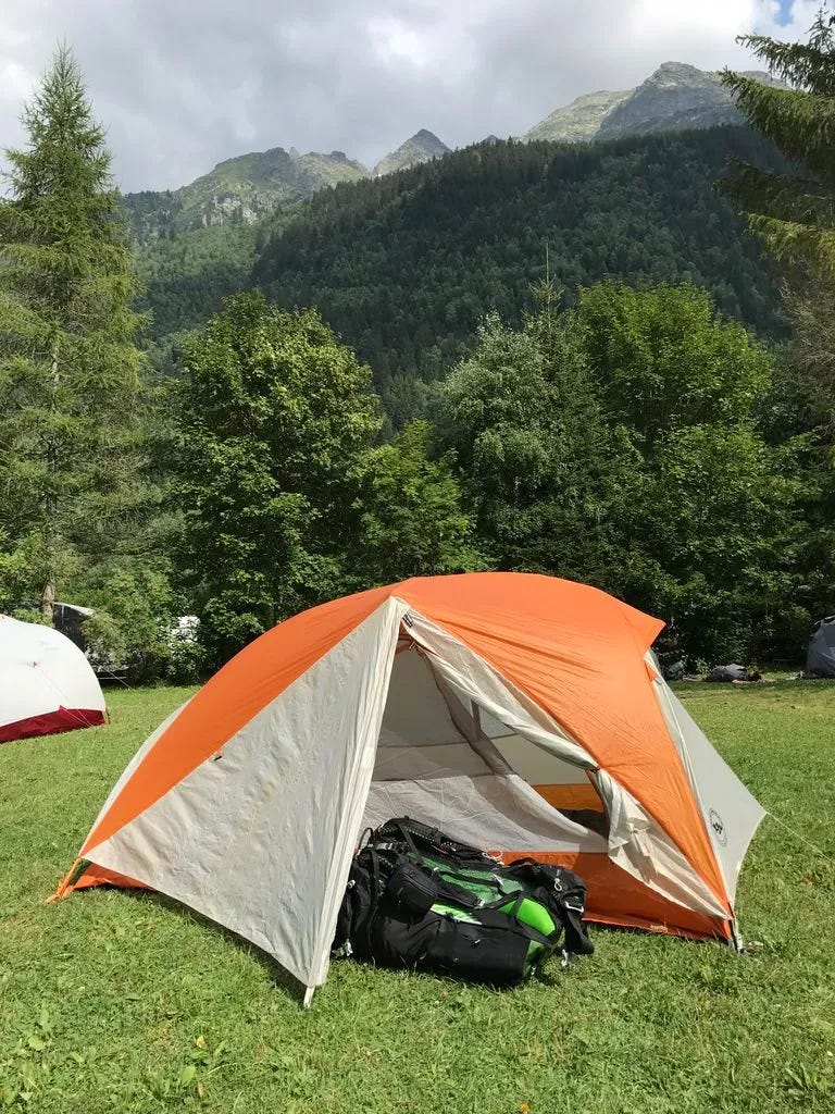 Overnight: Camping des Glaciers La Fouly (17 CHF to camp)A truly epic day: lush green valleys, glaciers for miles, sunshine, and good friends while hiking along Val Ferret. We then climbed over Grand Col Ferret, where we crossed from Italy into Switzerland. Then a long downhill to La Fouly, where we camped for the night under an impressive glacier. Each day I find myself saying that this was my favorite day. The scenery never disappoints. I finally feel like I have my hiking legs back, as I felt strong all day. I even managed to jog some of the flat and downhill sections, while carrying a full pack.